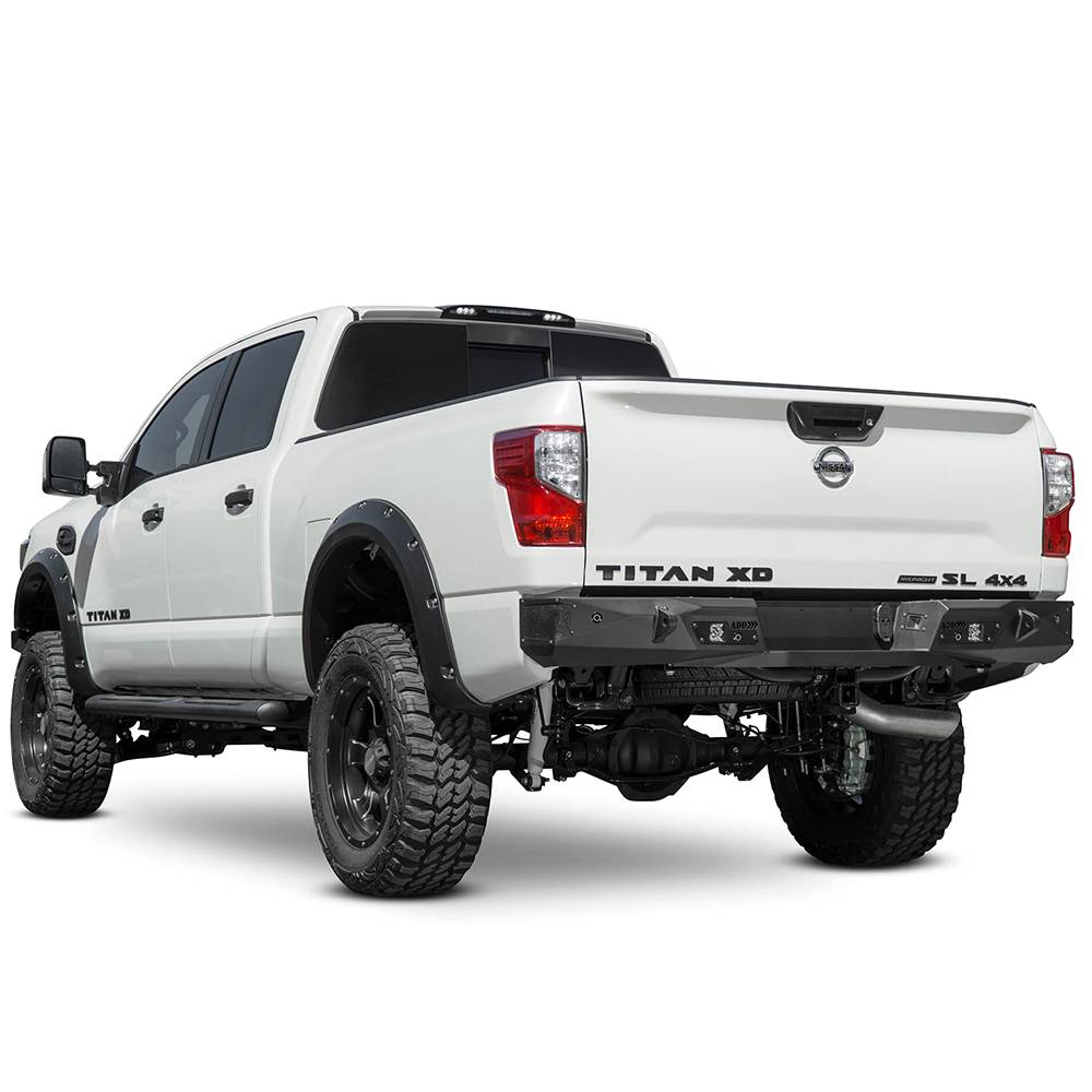 ADD Nissan titan XD stealth fighter rear bumper is one of the slimmest bumpers on the market. The stealth fighter adds protection with a unique style without adding bulk or size to the Titan. Two rear facing cube light mounts come standard with the stealth fighter and integrated reinforced clevis mounts accept a 3/4" D-Ring for added utility. Accommodations for factory parking sensors and blind spot sensors retains the OEM amenities in the stealth fighter rear bumper for the titan XD.