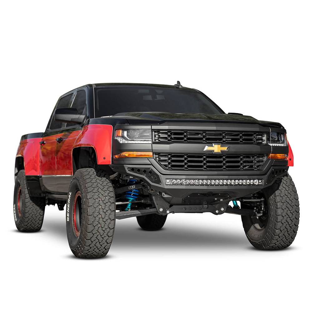 The rock fighter frame cut front bumper for the 2016-2018 Chevy Silverado 1500 gives your truck maximum approach angle with the lowest profile possible. The tight fitting design follows the grille body lines that gives the rock fighter a natural look that compliments the truck. A universal light mount in the center of the bumper allows mounting up to 10 cube lights or a 40" radius light bar. Mix and match any brand to fit the lighting setup you need. Optional rock fighter end caps extend the length of the bumper to line up with factory fenders.