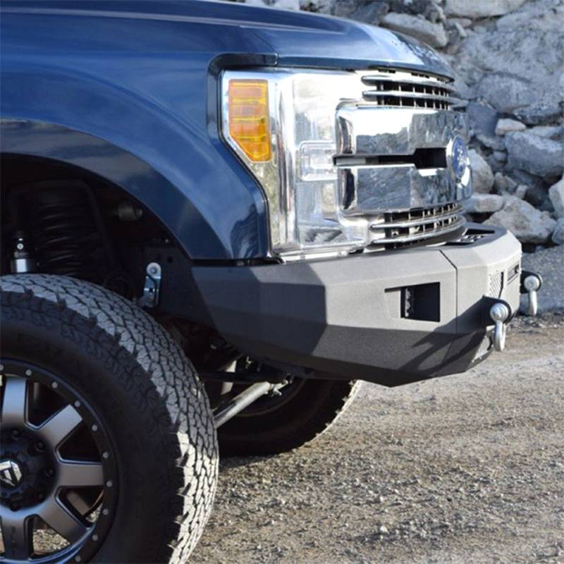Truck bumpers are a modular 3-piece design made with high tensile strength 3/16" steel and reinforced with 1/4" steel in key areas which allows them to accommodate up to a 12,500 lbs winch. We also use a 2 step powder coating process. First the bumper is coated with a thick layer of a proprietary compound for corrosion resistance, then we coat the bumper with our textured black, UV resistant, scratch resistant powder coating. The result is a bumper that will look good and perform well for the lifetime of the vehicle.