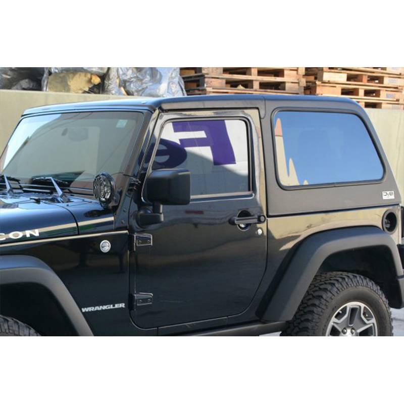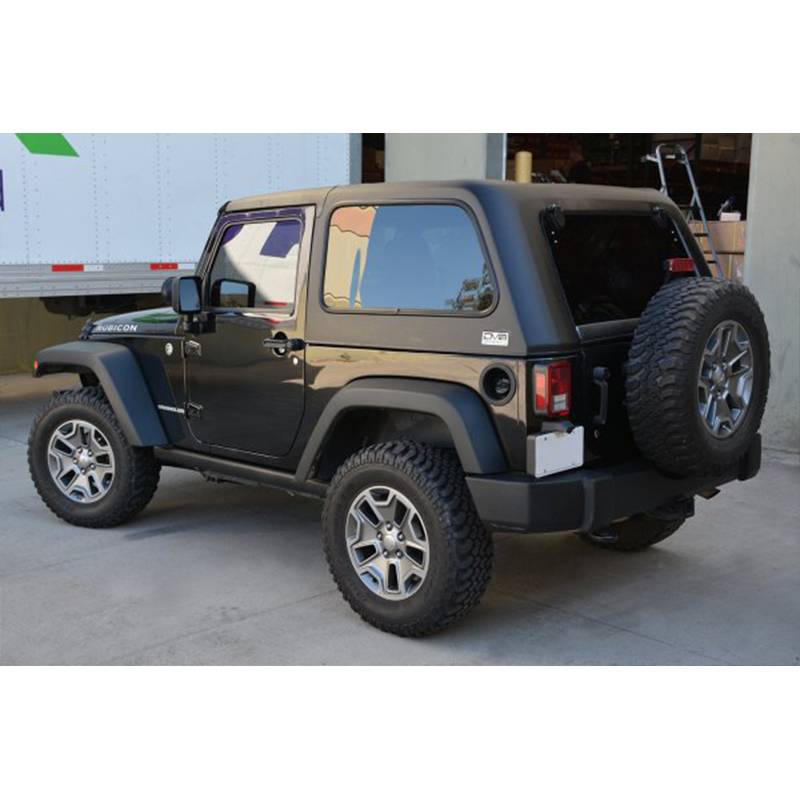 Road ranger hard tops are built in the United States and use high quality seals, fiberglass, and advanced aerodynamics to produce the quietest tops on the market. All of DV8 tops are a 2 piece design so the part over the front driver and passenger lifts off like a targa top. All tops have carpeted interior and tinted windows. This top is a Fast Back 2-Piece for 2 Door JK Jeep Wrangler.