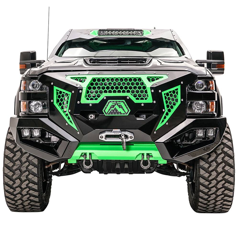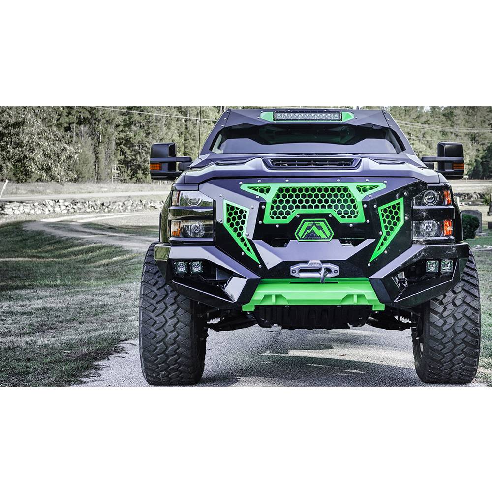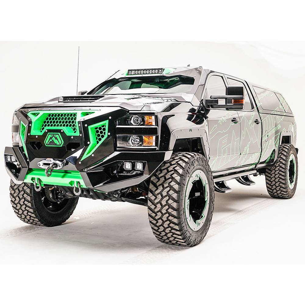 The Grumper truck offers a revolutionary combination of both grille and winch bumper. Fully Customizable with removable inserts, this aggressive yet sophisticated piece is sure to change the way we look at bumpers going forward for the Chevrolet Silverado.