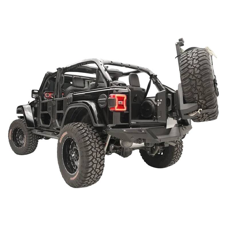 The Fab Fours Matched with exclusive Jeep JL Rear Bumper, the Adjustable Slant Back Tire Carrier adds that extra edge of utility to your new off-road machine. The new fully adjustable slant back tire carrier can be positioned at an upright 90 degree angle or can be tilted and locked at a 45 degree angle. It can also be adjusted for different wheel sizes and offsets and can accommodate up to a 40" tire.