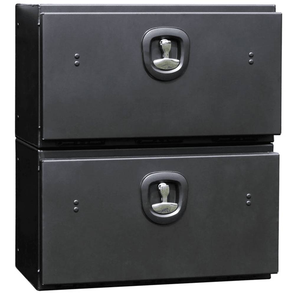 Drop down toolboxes are built to last and are constructed out of .125" aluminum to keep you from getting bogged down on the back-roads. They are sold individually but can be stacked and bolted together if you purchase two. Toolboxes latches come with a locking cylinder and keys as well as a padlock option. These boxes fit rear swing-out bumpers for Mercedes sprinter.