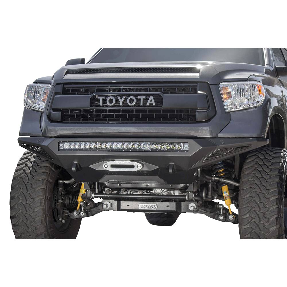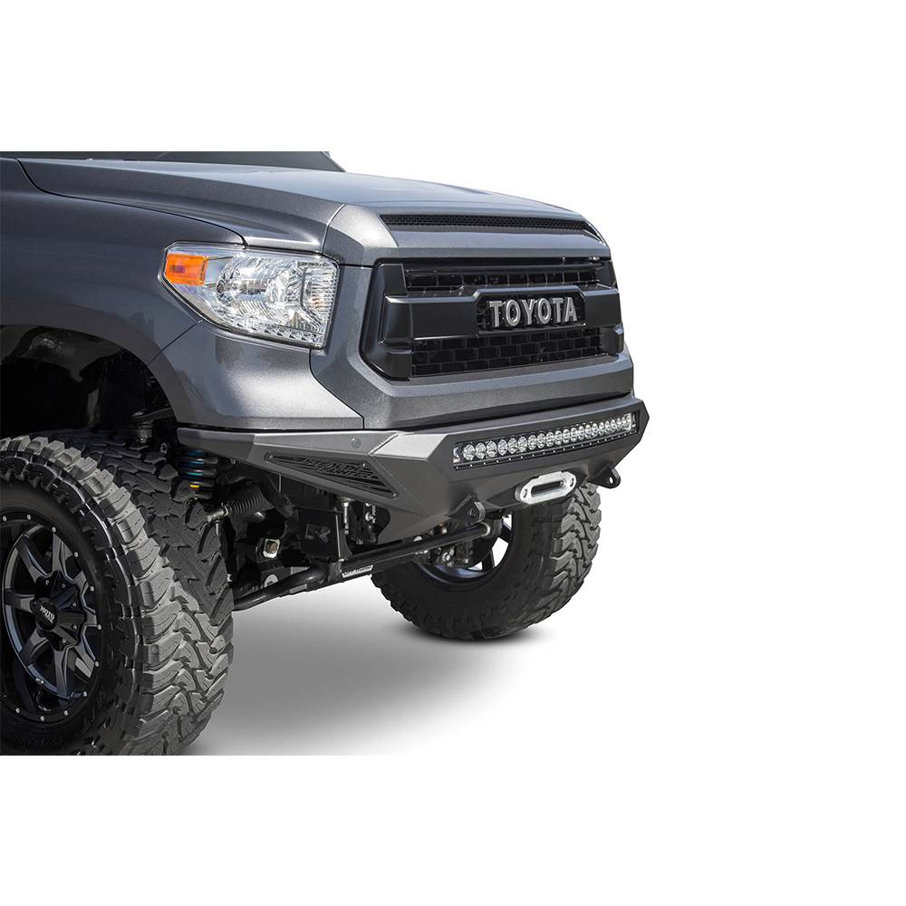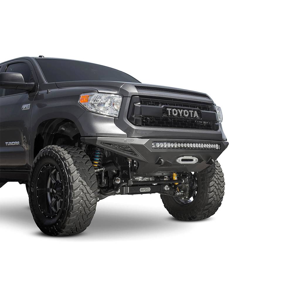 ADD stealth fighter front bumper for the Toyota tundra is an aggressive modern radius plate design that fits tight around the tundra's frontend. A steel plate design provides additional protection and a winch mount provides additional utility for your truck. The patented universal light mount system allows mounting up to 10 cube lights or a 40" radius LED bar into the center of the bumper. Additional lighting is available with 10" SR light bar mounts behind the side panels. Reinforced clevis mounts allow the use of a 3/4" D-ring for added utility. Optional front parking sensors cutouts retain the Toyota tundra's OEM features. Comes packaged with universal light mount kit to install any brand and size lighting combination.