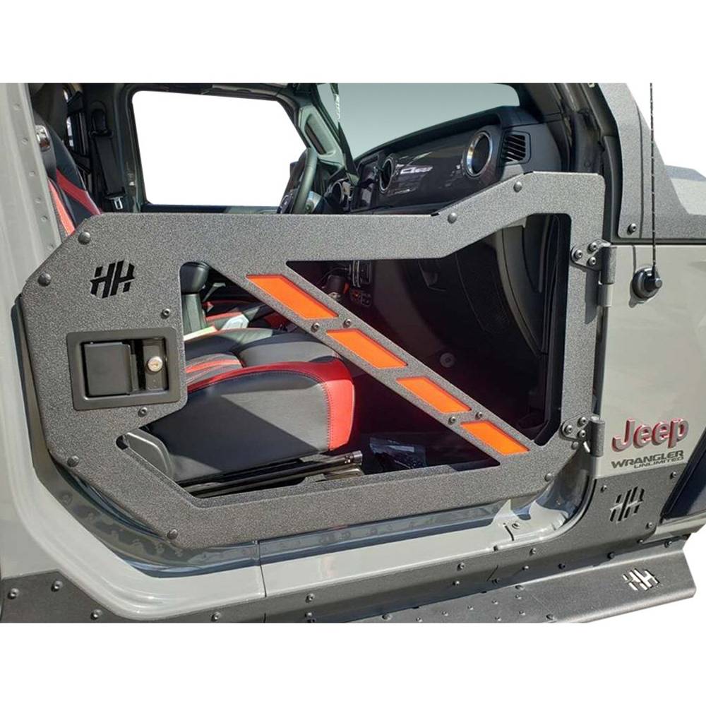 Rear trail door set designed with an accent plate that comes standard black powder coated, but is easily customizable to any color. Fully adjustable rotary and paddle latch combo (made in America) gives the doors a solid, OE-like connection with the Jeep. Rubber compression spring ensures a quiet ride with no rattling. Included with bolt-on door limiting straps, which keep the door from swinging too far and damaging the Jeep.
