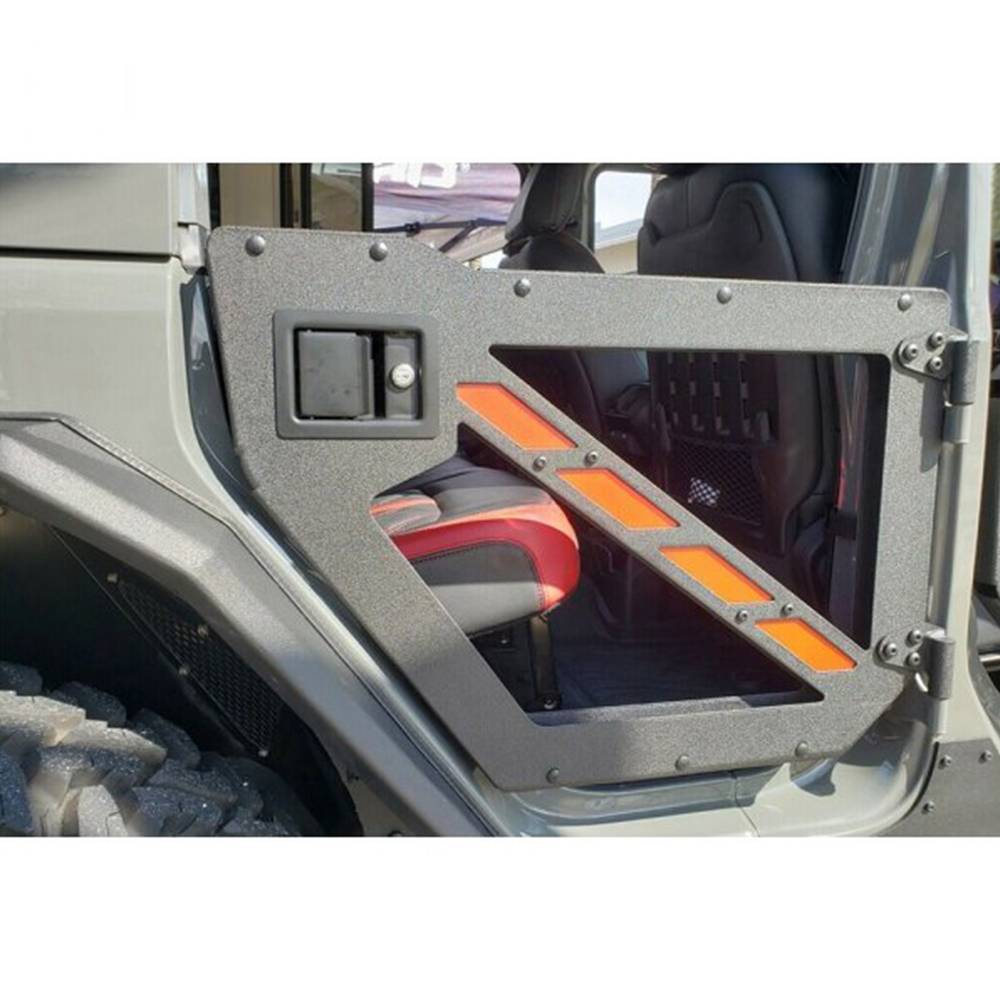 Rear trail door set designed with an accent plate that comes standard black powder coated, but is easily customizable to any color. Fully adjustable rotary and paddle latch combo (made in America) gives the doors a solid, OE-like connection with the Jeep. Rubber compression spring ensures a quiet ride with no rattling. Included with bolt-on door limiting straps, which keep the door from swinging too far and damaging the Jeep.