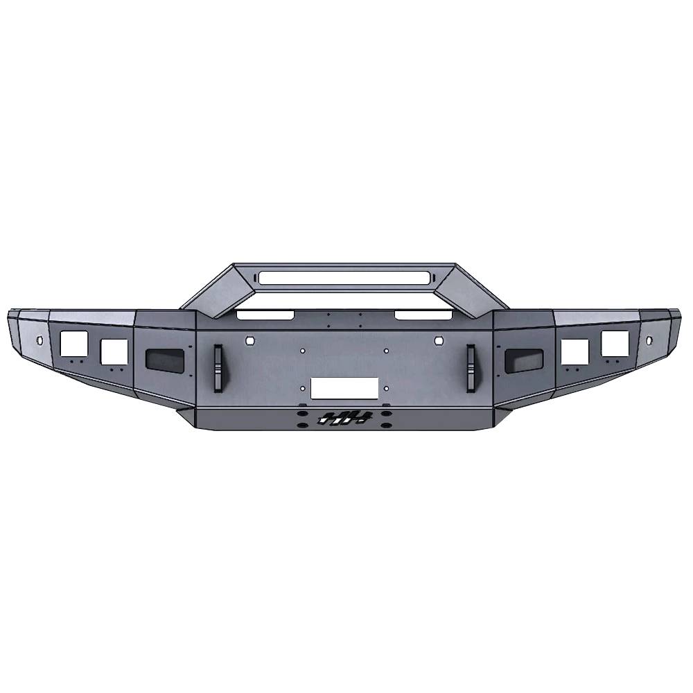 Hammerhead front bumpers are designed to be winch capable and stand up to the punishment of on-road and off-road driving. Accommodates up to four 3.25" x 3.25" external dimension cube after-market off-road fog lights, as well as a 21.5" total length single row light bar inside the formed sheet metal brush guard. Reinforced to allow for extra strength while keeping the bumper as light as possible. The shackle mounts are a part of the mounting surface to the frame, extending through the bumper and are welded on the inside and outside of the bumper. The formed sheet metal brush guard is made with 11 GA steel. This bumper will accommodate a front receiver hitch (which takes the place of the winch). Compatible with OE sensors.