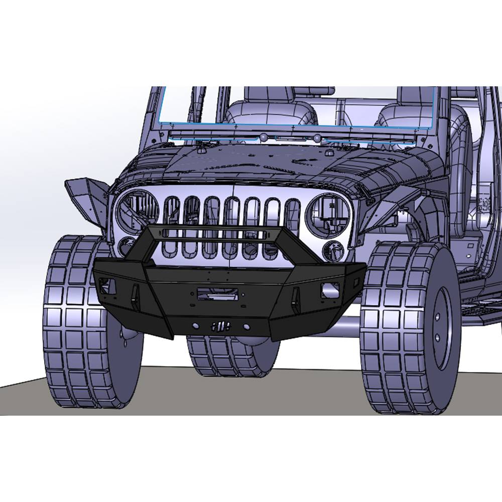 Includes a stubby JKX series front bumper, JKX series flush mount rear bumper with spare tire carrier, and 2-door JKX series running boards. The front bumper is designed to be winch capable, accommodates factory fog lights, and allows for a 20" single row light bar to be mounted inside the pre-runner bar. . The rear bumper does not include lights but can be upgraded to LED flush mount lights for an additional fee The front and rear bumpers come standard with shackle mounts, which are a part of the mounting surface, extending through the main plate of the bumper and welded all throughout the inside and outside of the bumper for added strength. The running boards are built using 2" x 0.120" diameter wall square tubing and mounted securely to the body mounts using OEM hardware. With the front bumper, frame flanges will need to be slightly trimmed to install Warn ZEON winches. When using a Warn ZEON winch, the vacuum pump relocation bracket is required. The OEM rock rails MUST be removed for running board installation.