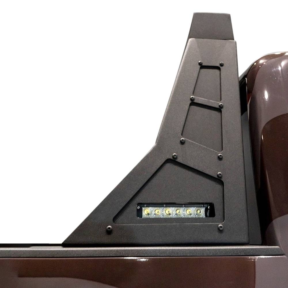 Hammerhead headache rack accommodates one 49.5" total length light bar in the center, two 7.4" light bars in the rear, and one 7.4" light bar on each side. No cutting or welding required for installation. Black-coated hardware included.