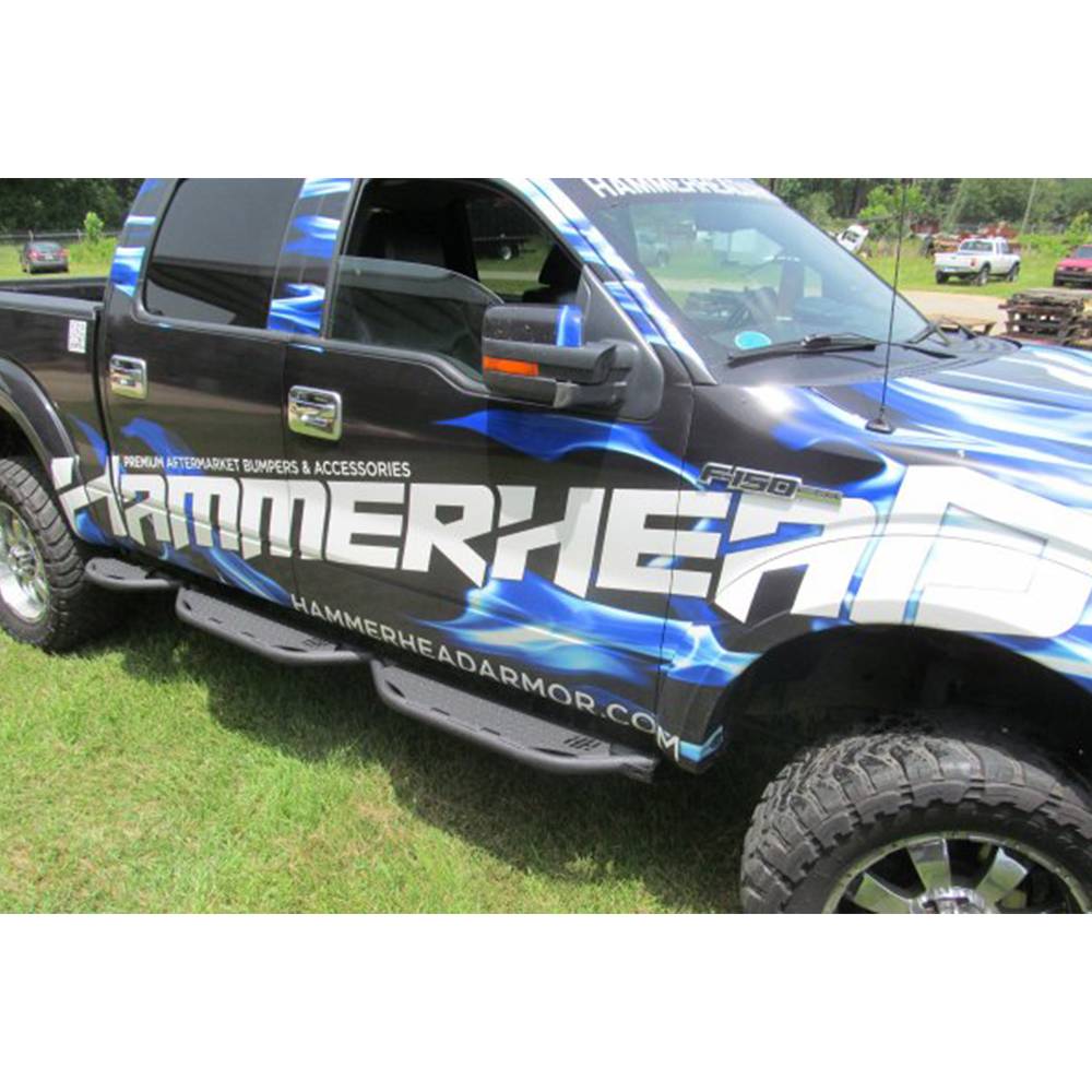 Get the Hammerhead black wheel to wheel running boards and make getting in and out of your vehicle a safer experience. Hammerhead running boards are built tough hold up to 300 pounds on each stepping platform, with three platforms on each board. Hammerhead wheel to wheel running boards are made in the USA from high grade 1.75" steel tubing and are finished in a 2 stage black powder-coat that will hold up to the harshest conditions.