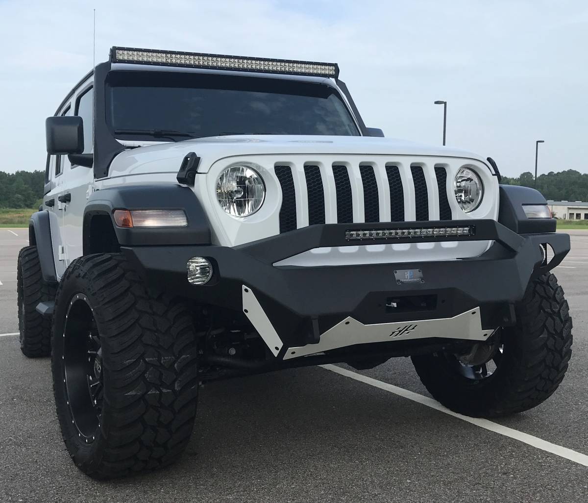 Hammerhead front bumpers are designed to be winch capable. Extends the entire width of the factory sport/Sahara flares to fully protect the Jeep and provide a clean look. Signature accent plates designed specifically for the Ravager Series really set the bumper apart from the crowd. Made with 3/4" shackle mounts and stands up to the punishment of on-road and off-road driving all while keeping the bumper as light as possible. The shackle mounts are a part of the mounting surface to the frame, extending through the bumper and are welded on the inside and outside of the bumper making for an excellent recovery point. Has placement for OEM fog lights, and it allows for a 21.5" single row light bar to be mounted inside the pre-runner bar for great lighting capability and a smooth look. We only sell the accent plates in a black wrinkle powder coat finish. Any color-matching will need to be done by the customer or by an outside source. Will not fit flush with OE Rubicon flares will have approximately a 2" gap between the bumper and the flare. Will fit flush with the OE Sport/Sahara flares. This bumper will not work with front sensors.