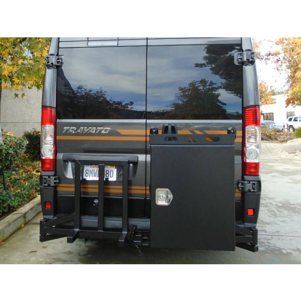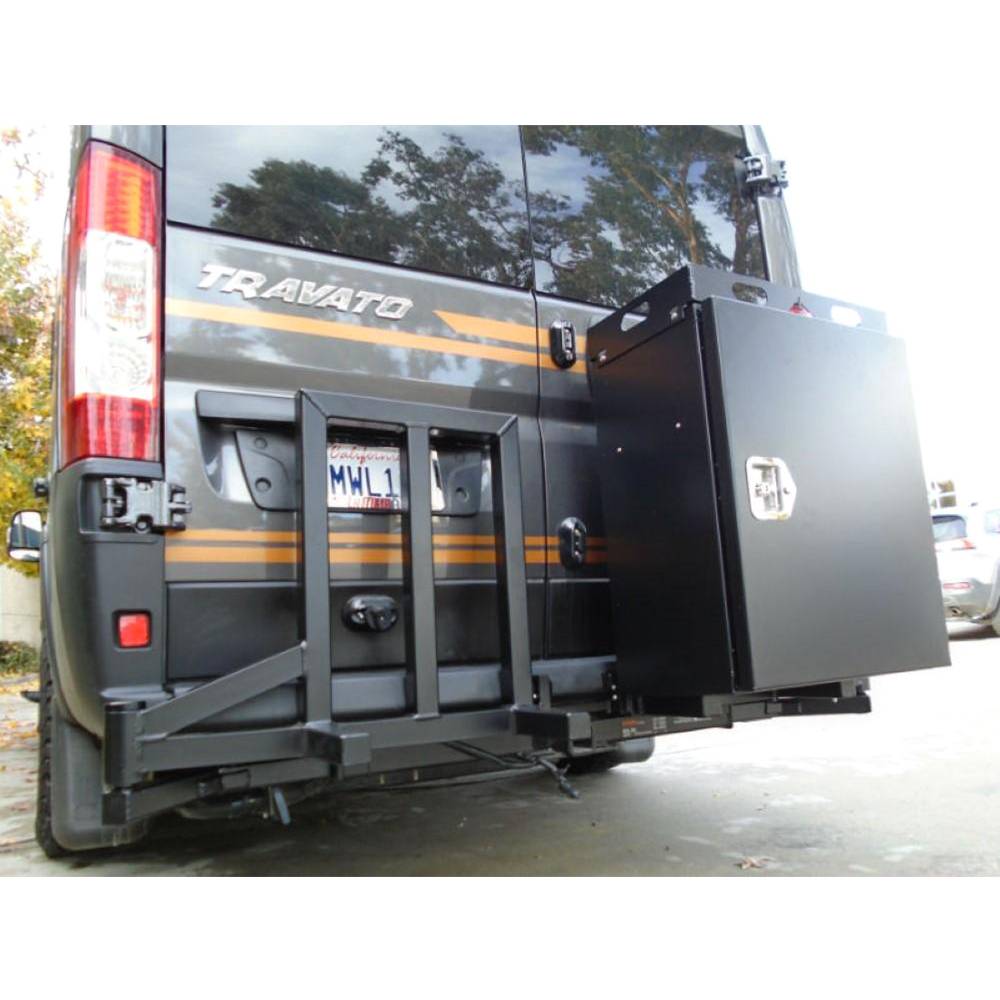 Storage is at a premium on van builds. Aluminess has developed a solution to this with our swing our tire and box carrier. Add piece of mind to your existing RV Conversion that may not have come with a spare tire or relocate your existing spare tire for extra storage underneath the van. Want extra storage? Instead of mounting a spare tire, add one of our boxes for the ultimate outdoor storage compartment. The same swing arm is able to hold either a tire or a box.