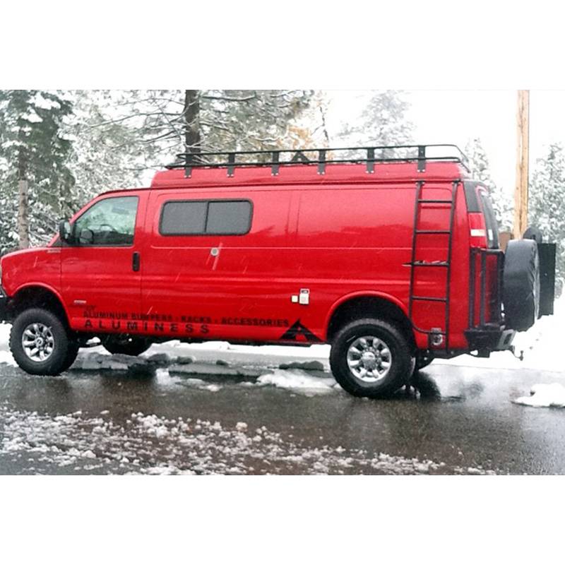 Whether you have an Aluminess roof rack, or just a plastic storage box, the van roofs are a great place to store bulky things. The problem is how you get up there to strap everything down. Aluminess solves this problem with their all aluminum ladders. These mount to the side of the vehicle solving the problem of drilling through your rear van door.