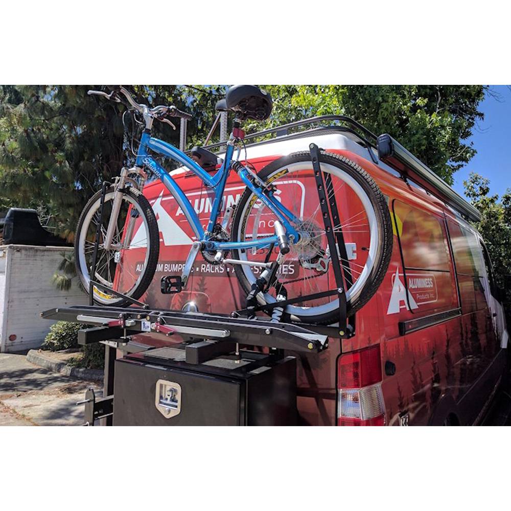 The Aluminess Bike Rack Swing Arm is designed to replace the existing box arm on your Aluminess rear bumper. The bike rack swing arm is able to hold 2 bikes and swing open with your Aluminess Box. The swing arm is designed to clear tires up to 35" in diameter and is available for most of Aluminess existing rear bumpers. The swing arm is capable of holding 100 pounds on the upper platform and 100 pounds on the lower platform. Aluminess recommends the swing arm be installed with 1-UP USA bike rack trays. They are available for purchase from Aluminess with necessary hardware for easy installation. Other bike rack trays may work with Aluminess platform, but have not been tested.