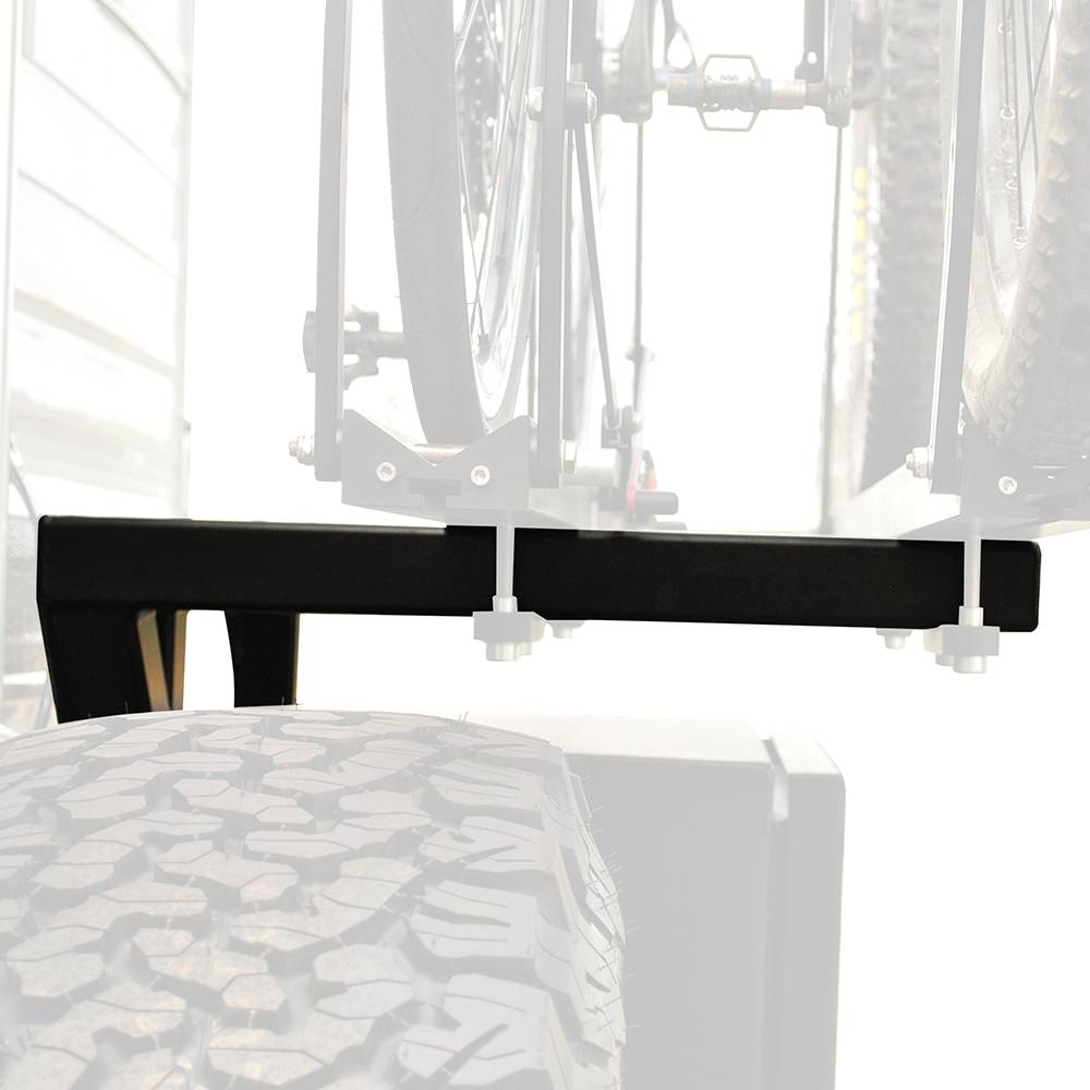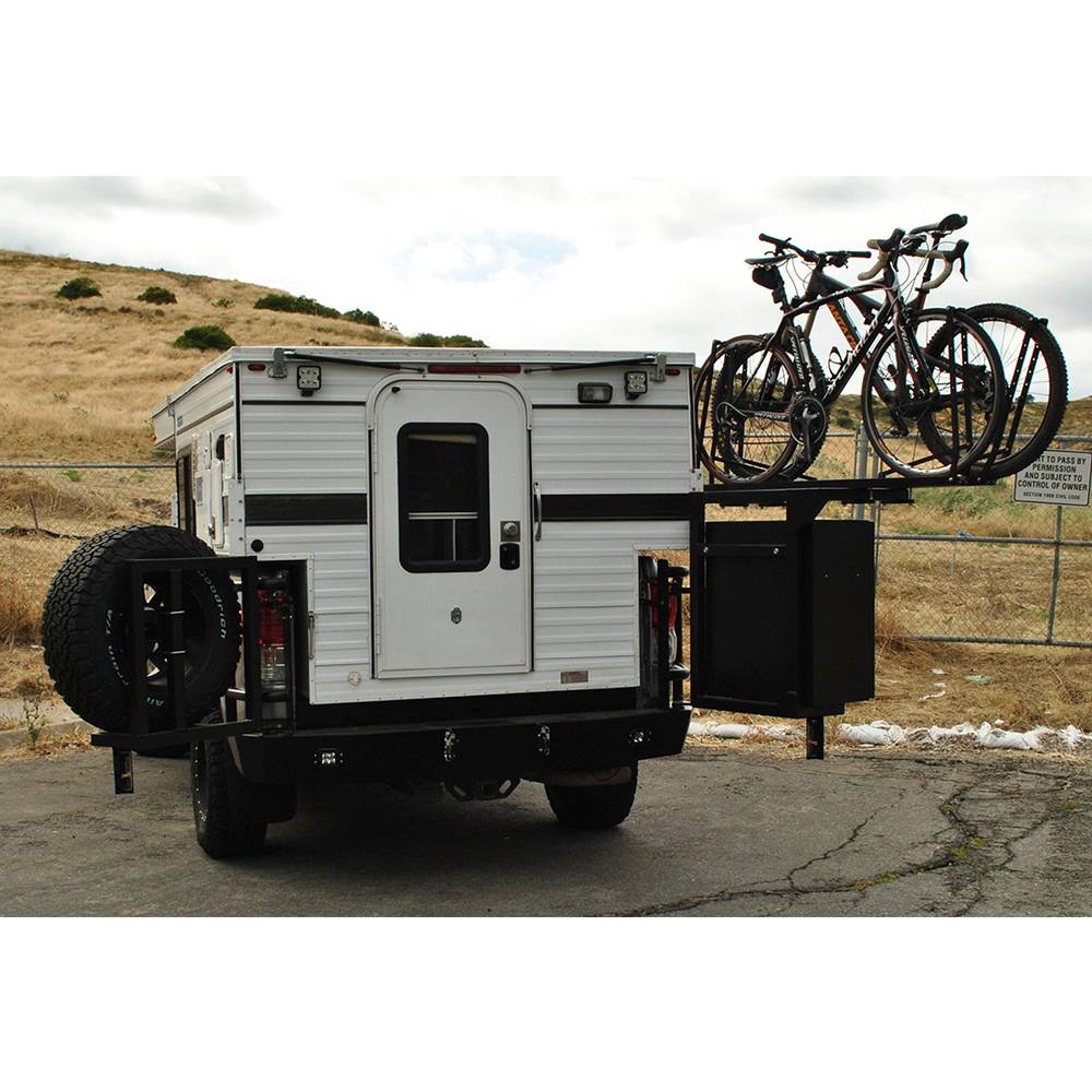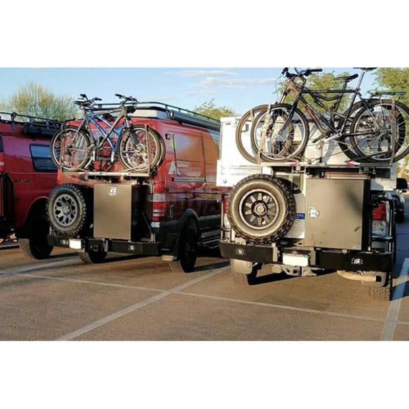 The Aluminess Bike Rack Swing Arm is designed to replace the existing box arm on your Aluminess rear bumper. The bike rack swing arm is able to hold 2 bikes and swing open with your Aluminess Box. The swing arm is designed to clear tires up to 35" in diameter and is available for most of Aluminess existing rear bumpers. The swing arm is capable of holding 100 pounds on the upper platform and 100 pounds on the lower platform. Aluminess recommends the swing arm be installed with 1-UP USA bike rack trays. They are available for purchase from Aluminess with necessary hardware for easy installation. Other bike rack trays may work with Aluminess platform, but have not been tested.