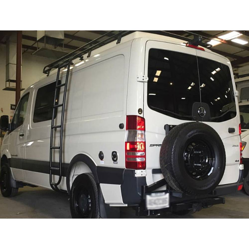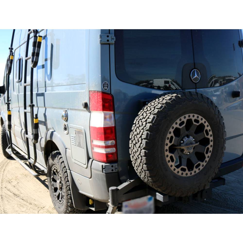 A common modification for Mercedes Sprinter is to remove the spare tire from underneath the vehicle in order to put extra fuel or fresh water tanks. Aluminess has developed a bolt on aluminum tire rack that doesnt mount through the rear door. The tire carrier still lets you open your door past the 90 degree lock and opens and shuts with ease. Tire carrier for the Sprinter comes equipped with a license plate relocation bracket, license plate light, and a universal mounting system to compensate for all tire sizes, backspacing, and bolt patterns.