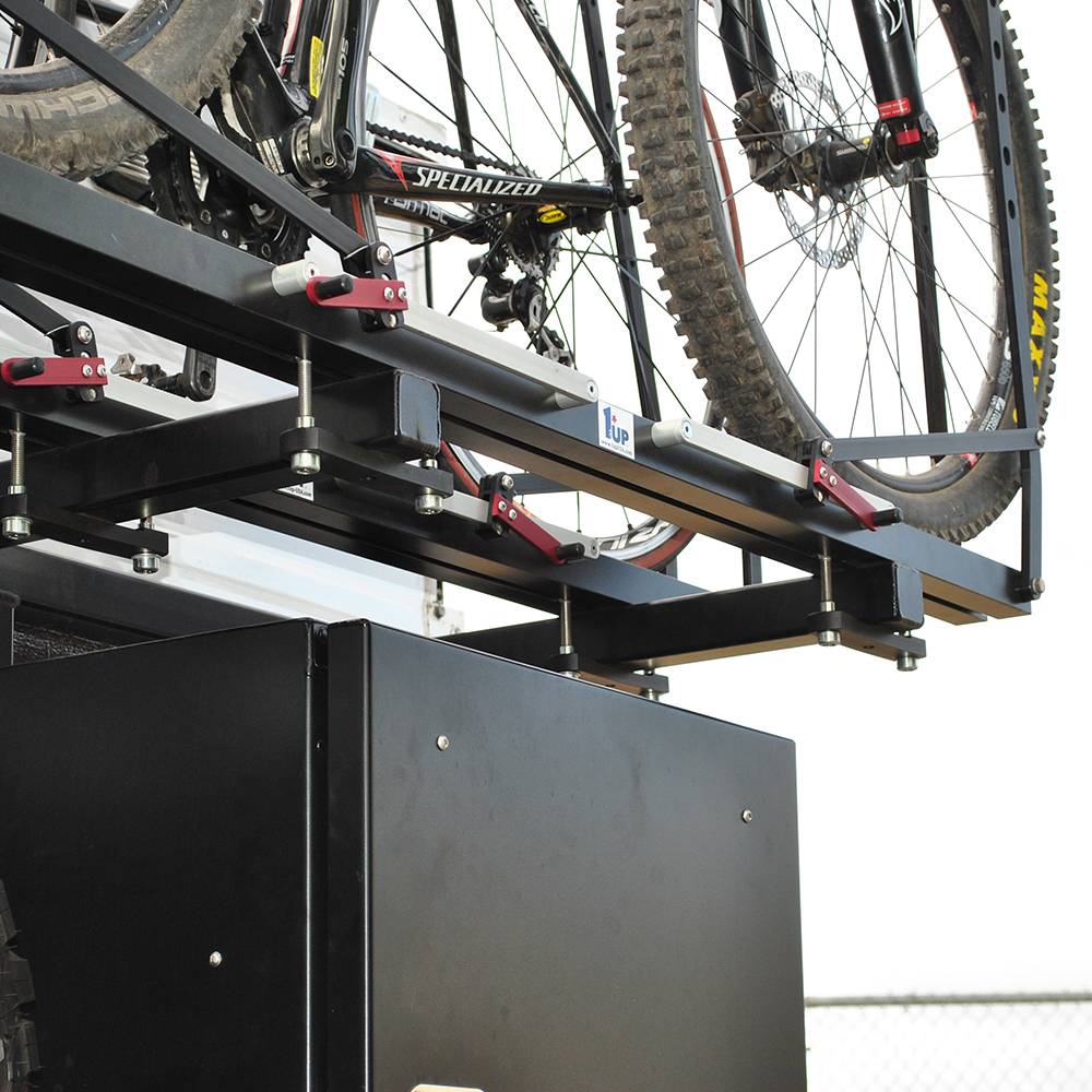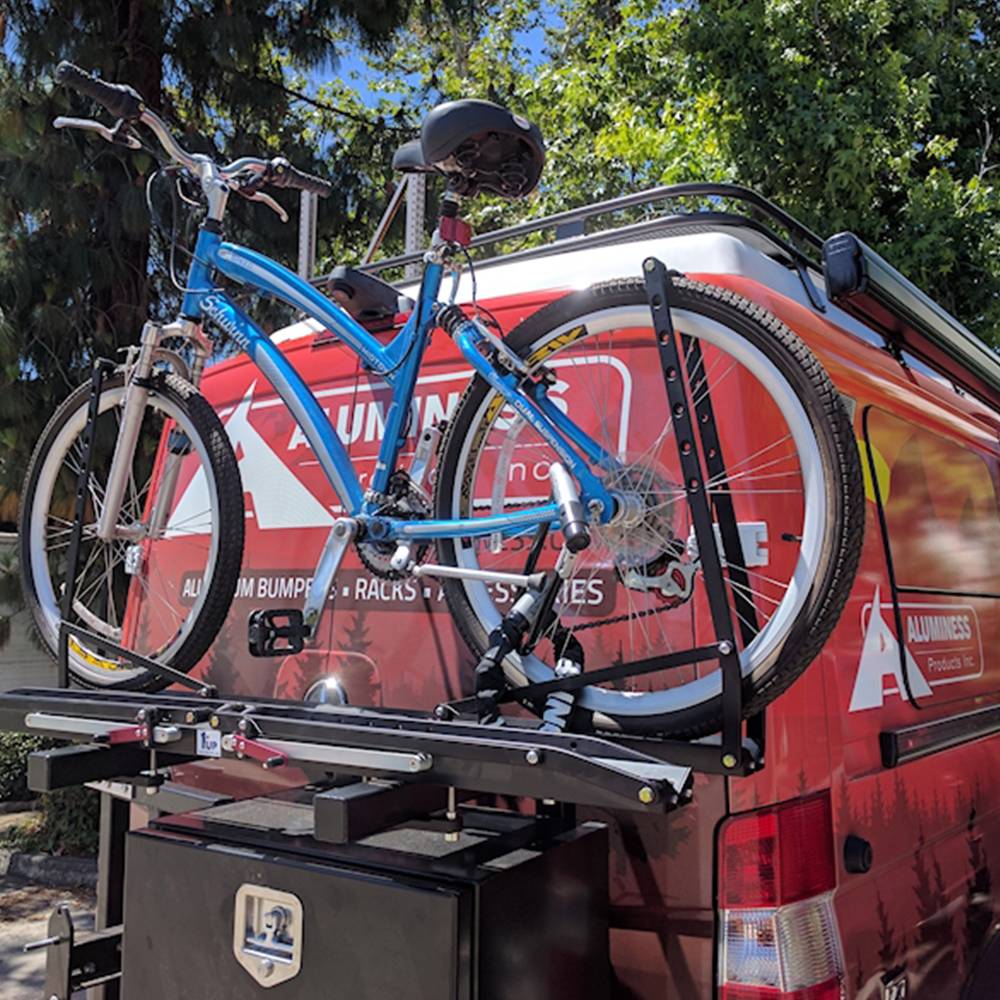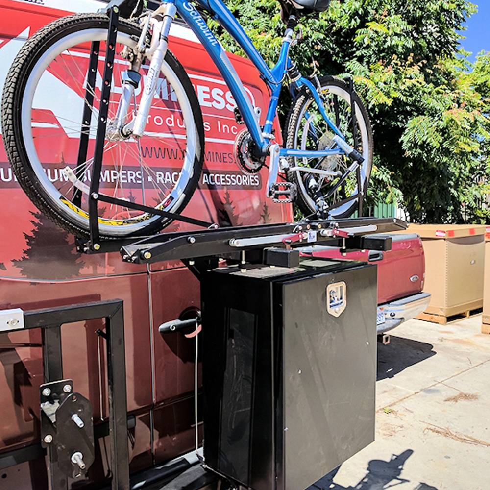 The Aluminess Bike Rack Swing Arm is designed to replace the existing box arm on your Aluminess rear bumper. The bike rack swing arm is able to hold 2 bikes and swing open with your Aluminess Box. The swing arm is designed to clear tires up to 35" in diameter and is available for most of existing rear bumpers. The swing arm is capable of holding 100 pounds on the upper platform and 100 pounds on the lower platform. Aluminess recommends the swing arm be installed with 1-UP USA bike rack trays. They are available for purchase from Aluminess with necessary hardware for easy installation. Other bike rack trays may work with platform, but have not been tested. Therefore, no warranty is available with other bike rack mounts.