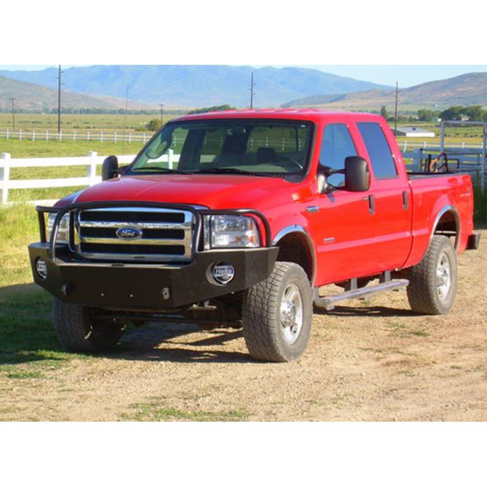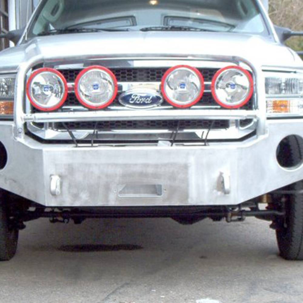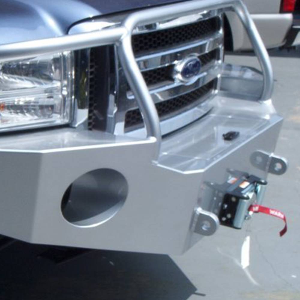 The Aluminess front winch bumpers for the 2005-2007 Ford Super Duty truck will hold a large winch and come with integrated tow hooks. Wet and salty environments can wreak havoc on steel bumpers and make them rust out in no time. Aluminum doesn't rust, so you can be sure that your Aluminess off road bumper will hold up even in salty environments. The lighter weight of aluminum also prolongs the life of your brakes, tires, suspension, and steering when compared to steel bumpers. Despite it being light weight, it is still very strong. Aluminess bumpers have survived collisions with deer, bear, and elk. The front winch bumper for the 2005-2007 Ford Super Duty truck was designed specifically for the vehicle to match all of the body lines. This off road bumper looks as good as it functions.