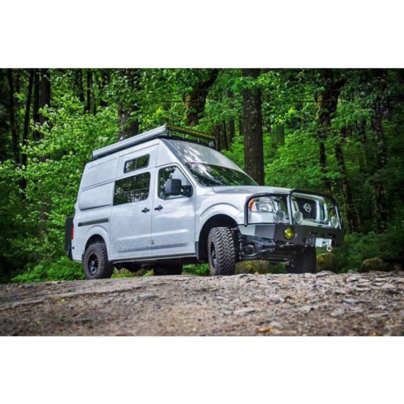 Nissan has entered the off-road adventure and camping markets with the introduction of their new Nissan NV. This full-size van is built for the United States and sold by Nissan. Owners of the Nissan NV can now customize the inside and outside of their van to meet all their off-road and camping needs. Several companies are even creating 4-wheel drive conversions for the 2500 cargo van NV and the 3500 passenger van NV model! It's time to outfit your Nissan NV with a rugged off-road aluminum front winch bumper from Aluminess. The bumper provides additional protection for your vehicle, versatility, and storage for any camping needs. The Aluminess front winch bumper for the Nissan NV fits a number of winch sizes and has integrated shackle mounts. The all aluminum construction weighs only 85 pounds and won't rust. The powder-coating doesn't flake or peel resulting in an durable finish for your bumper.