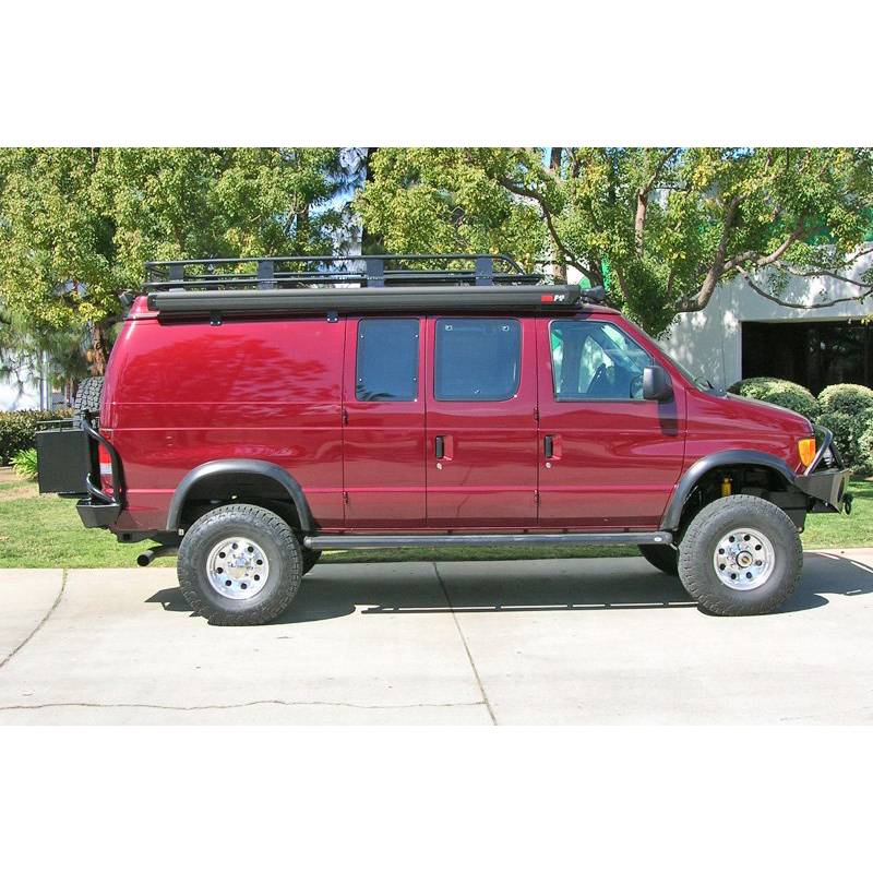 Aluminum roof rack is perfect for carrying cargo boxes, surf boards or just lounging around and watching the world go by. The standard length on the roof rack is from the rear of the van up to the back of the front doors. This gives ample storage space while keeping cargo behind your head and reducing noise.