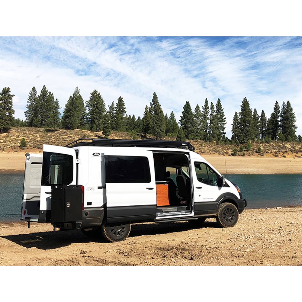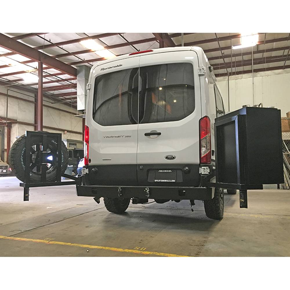 Storage is always at a premium on expedition vehicles. Being able to store dirty and bulky gear outside of your van is the best way to go. With slimline rear bumper with swing arms, designed for the Ford Transit, you can keep dirty and grungy equipment outside of your sleeping quarters without having to worry about theft. Rear bumper with swing arms can be set up with a spare tire carrier and box carrier or 2 box carriers. Any of storage boxes can be mounted to the box swing arm. You can store a generator, recovery gear, tools, or anything else you can dream up. An integrated hitch supports the swing arm assembly to complete the package.