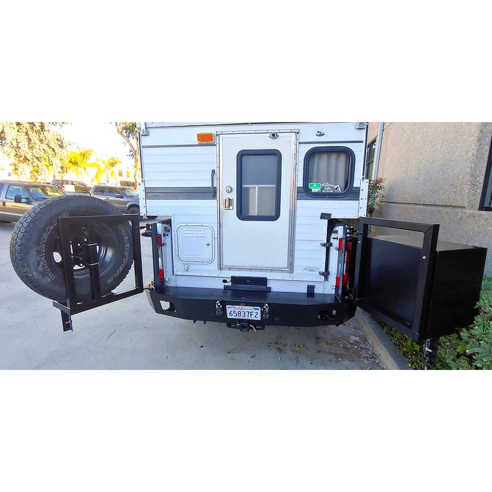Aluminess off road rear bumpers were originally designed for trucks with campers. Extra storage and easy access to the spare tire are very important and aluminum rear bumper delivers. Now off road enthusiasts of all types are enjoying the benefits of Aluminess bumpers. With the option to carry over-sized spares, extra fuel, and watertight storage, there isnt an off roader that cant find a use for an rear bumpers.