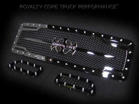 Royalty Core developed their RC2 Twin Mesh grille with a unique blend of two styles of mesh working together like never see before. This sporty grille frame curves to compliment custom logos very well. Each corner of the design has smaller accent mesh while exposing Royalty Core's race proven diamond mesh for accelerated airflow and appearance. Royalty Core's proprietary corrosion resistant stainless technology creates the most durable grille on the planet. Absolutely every piece is 100% T304 stainless steel. It's engineered to exploit the cleanest installation possible for your specific truck model. This Royalty Core grille is customized to best match your truck with military grade strength you can count on such as a 12 gauge stainless steel construction, optimal mounting brackets, CNC precision machined brackets, frame, and logos, hand fabricated, all gloss surfaces are buffed to a deep smooth mirrored finish,triple chrome plated T304 stainless studs around frame with star flange design, stainless super woven mesh, and absolutely no plastic. Royalty Core offers the industry's largest customized line of grilles and logos available.