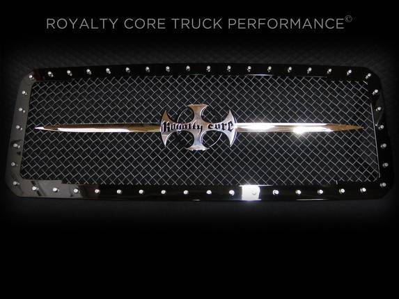 Royalty Core's classic RC1 grille design has clean lines with a dynamic 2-tone appearance for truck enthusiasts looking to make a bold statement. This RC1 design screams 1 custom grille and it shows with a distinct footprint. This grille exposes Royalty Core's race proven diamond mesh for accelerated airflow and appearance. Royalty Core's proprietary corrosion resistant stainless technology creates the most durable grille on the planet. Absolutely every piece is 100% T304 stainless steel. It's engineered to exploit the cleanest installation possible for your specific truck model. This Royalty Core grille is customized to best match your truck with military grade strength you can count on such as a 12 gauge stainless steel construction, optimal mounting brackets, CNC precision machined brackets, frame, and logos, hand fabricated, all gloss surfaces are buffed to a deep smooth mirrored finish,triple chrome plated T304 stainless studs around frame with star flange design, stainless super woven mesh, and absolutely no plastic. Royalty Core offers the industry's largest customized line of grilles and logos available.
