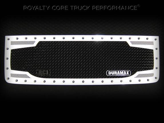 Royalty Core developed their RC2 Twin Mesh grille with a unique blend of two styles of mesh working together like never see before. This sporty grille frame curves to compliment custom logos very well. Each corner of the design has smaller accent mesh while exposing Royalty Core's race proven diamond mesh for accelerated airflow and appearance. Royalty Core's proprietary corrosion resistant stainless technology creates the most durable grille on the planet. Absolutely every piece is 100% T304 stainless steel. It's engineered to exploit the cleanest installation possible for your specific truck model. This Royalty Core grille is customized to best match your truck with military grade strength you can count on such as a 12 gauge stainless steel construction, optimal mounting brackets, CNC precision machined brackets, frame, and logos, hand fabricated, all gloss surfaces are buffed to a deep smooth mirrored finish,triple chrome plated T304 stainless studs around frame with star flange design, stainless super woven mesh, and absolutely no plastic. Royalty Core offers the industry's largest customized line of grilles and logos available.