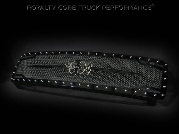 Royalty Core developed their RC2 Twin Mesh grille with a unique blend of two styles of mesh working together like never see before. This sporty grille frame curves to compliment custom logos very well. Each corner of the design has smaller accent mesh while exposing Royalty Core's race proven diamond mesh for accelerated airflow and appearance. Royalty Core's proprietary corrosion resistant stainless technology creates the most durable grille on the planet. Absolutely every piece is 100% T304 stainless steel. It's engineered to exploit the cleanest installation possible for your specific truck model. This Royalty Core grille is customized to best match your truck with military grade strength you can count on such as a 12 gauge stainless steel construction, optimal mounting brackets, CNC precision machined brackets, frame, and logos, hand fabricated, all gloss surfaces are buffed to a deep smooth mirrored finish,triple chrome plated T304 stainless studs around frame with star flange design, stainless super woven mesh, and absolutely no plastic. Royalty Core offers the industry's largest customized line of grilles and logos available.