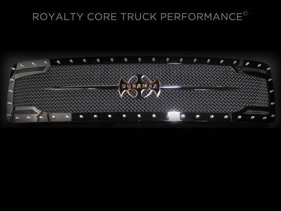 Royalty Core developed their RC2 Twin Mesh grille with a unique blend of two styles of mesh working together like never see before. This sporty grille frame curves to compliment custom logos very well. Each corner of the design has smaller accent mesh while exposing Royalty Core's race proven diamond mesh for accelerated airflow and appearance. Royalty Core's proprietary corrosion resistant stainless technology creates the most durable grille on the planet. Absolutely every piece is 100% T304 stainless steel. It's engineered to exploit the cleanest installation possible for your specific truck model. This Royalty Core grille is customized to best match your truck with military grade strength you can count on such as a 12 gauge stainless steel construction, optimal mounting brackets, CNC precision machined brackets, frame, and logos, hand fabricated, all gloss surfaces are buffed to a deep smooth mirrored finish,triple chrome plated T304 stainless studs around frame with star flange design, stainless super woven mesh, and absolutely no plastic. Royalty Core offers the industry's largest customized line of grilles and logos available.