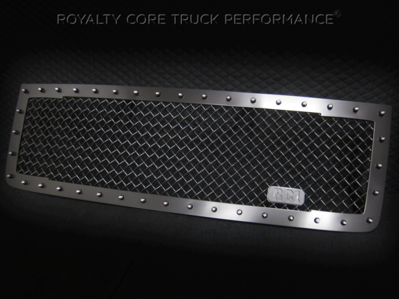 Royalty Core's classic RC1 grille design has clean lines with a dynamic 2-tone appearance for truck enthusiasts looking to make a bold statement. This RC1 design screams 1 custom grille and it shows with a distinct footprint. This grille exposes Royalty Core's race proven diamond mesh for accelerated airflow and appearance. Royalty Core's proprietary corrosion resistant stainless technology creates the most durable grille on the planet. Absolutely every piece is 100% T304 stainless steel. It's engineered to exploit the cleanest installation possible for your specific truck model. This Royalty Core grille is customized to best match your truck with military grade strength you can count on such as a 12 gauge stainless steel construction, optimal mounting brackets, CNC precision machined brackets, frame, and logos, hand fabricated, all gloss surfaces are buffed to a deep smooth mirrored finish,triple chrome plated T304 stainless studs around frame with star flange design, stainless super woven mesh, and absolutely no plastic. Royalty Core offers the industry's largest customized line of grilles and logos available.