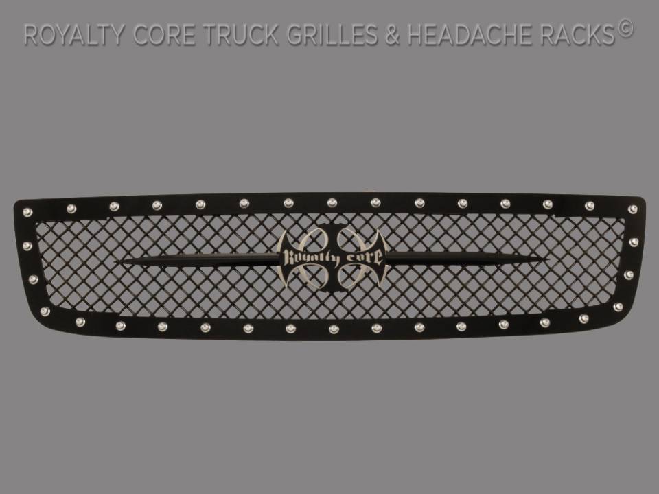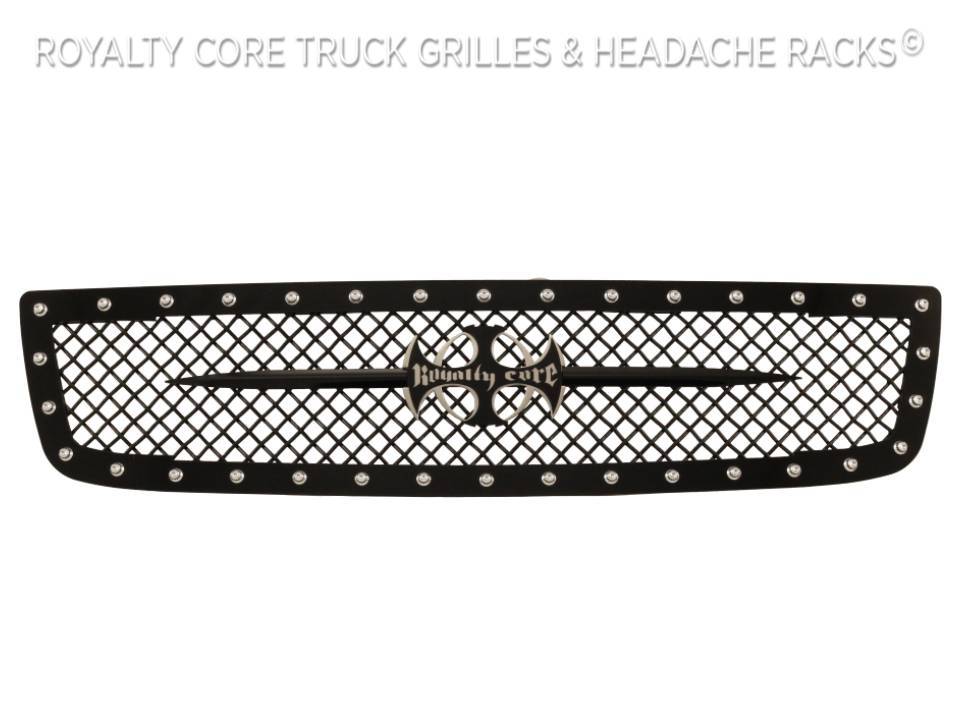 Royalty Core's classic RC1 grille design has clean lines with a dynamic 2-tone appearance for truck enthusiasts looking to make a bold statement. This RC1 design screams 1 custom grille and it shows with a distinct footprint. This grille exposes Royalty Core's race proven diamond mesh for accelerated airflow and appearance. Royalty Core's proprietary corrosion resistant stainless technology creates the most durable grille on the planet. Absolutely every piece is 100% T304 stainless steel. It's engineered to exploit the cleanest installation possible for your specific truck model. This Royalty Core grille is customized to best match your truck with military grade strength you can count on such as a 12 gauge stainless steel construction, optimal mounting brackets, CNC precision machined brackets, frame, and logos, hand fabricated, all gloss surfaces are buffed to a deep smooth mirrored finish, half inch detailed star point stainless stud design with secondary option for dimension, 5/16 & 3/8 threads, stainless super woven mesh, and absolutely no plastic. Royalty Core offers the industry's largest customized line of grilles and logos available.