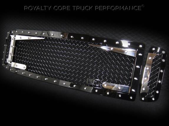 Royalty Core's Innovative RC3DX grille is literally explosive with raised graphics actually elevated from the grille. Its three dimensional aggressive lines are absolutely intimating and fast looking while sitting still. Each corner of the design has smaller accent mesh while exposingRoyalty Core's race proven diamond mesh for accelerated airflow and appearance. Royalty Core's proprietary corrosion resistant stainless technology creates the most durable grille on the planet. Absolutely every piece is 100% T304 stainless steel. It's engineered to exploit the cleanest installation possible for your specific truck model. This Royalty Core grille is customized to best match your truck with military grade strength you can count on such as a 12 gauge stainless steel construction, optimal mounting brackets, CNC precision machined brackets, frame, and logos, hand fabricated, all gloss surfaces are buffed to a deep smooth mirrored finish,triple chrome plated T304 stainless studs around frame with star flange design, stainless super woven mesh, and absolutely no plastic. Royalty Core offers the industry's largest customized line of grilles and logos available.