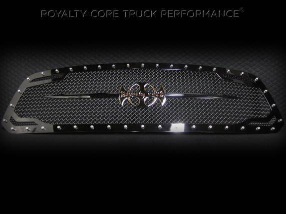 Royalty Core developed their RC2 Twin Mesh grille with a unique blend of two styles of mesh working together like never see before. This sporty grille frame curves to compliment custom logos very well. Each corner of the design has smaller accent mesh while exposing Royalty Core's race proven diamond mesh for accelerated airflow and appearance. Royalty Core's proprietary corrosion resistant stainless technology creates the most durable grille on the planet. Absolutely every piece is 100% T304 stainless steel. It's engineered to exploit the cleanest installation possible for your specific truck model. This Royalty Core grille is customized to best match your truck with military grade strength you can count on such as a 12 gauge stainless steel construction, optimal mounting brackets, CNC precision machined brackets, frame, and logos, hand fabricated, all gloss surfaces are buffed to a deep smooth mirrored finish,triple chrome plated T304 stainless studs around frame with star flange design, stainless super woven mesh, and absolutely no plastic. Royalty Core offers the industry's largest customized line of grilles and logos available.