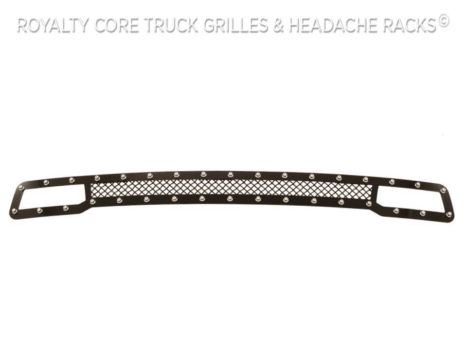 Complete and reinforce your truck with Royalty Core's impressive bumper grille package. This uniquely designed bumper grille smooths your factory bumpers dead space while exposing the function of your tow hooks. The options on your bumper grille will come to match when ordered with your main upper grille.Each grille has been rigorously tested by Royalty Core engineers to maximize protection, appearance, and performance on and off-road. Lab tried with rapid salt and chemical spray tests proving the most resilient grille on the market against the harshest conditions. Simple direct bolt on Royalty Core grilles are engineered to exploit the cleanest installation possible for your specific truck model.Royalty Core's proprietary corrosion resistant stainless technology creates the most durable grille on the planet. Absolutely every piece is 100% T304 stainless steel. It's engineered to exploit the cleanest installation possible for your specific truck model. This Royalty Core grille is customized to best match your truck with military grade strength you can count on such as a 12 gauge stainless steel construction, optimal mounting brackets, CNC precision machined brackets, frame, and logos, hand fabricated, all gloss surfaces are buffed to a deep smooth mirrored finish,triple chrome plated T304 stainless studs around frame with star flange design, stainless super woven mesh, and absolutely no plastic. Royalty Core offers the industry's largest customized line of grilles and logos available.