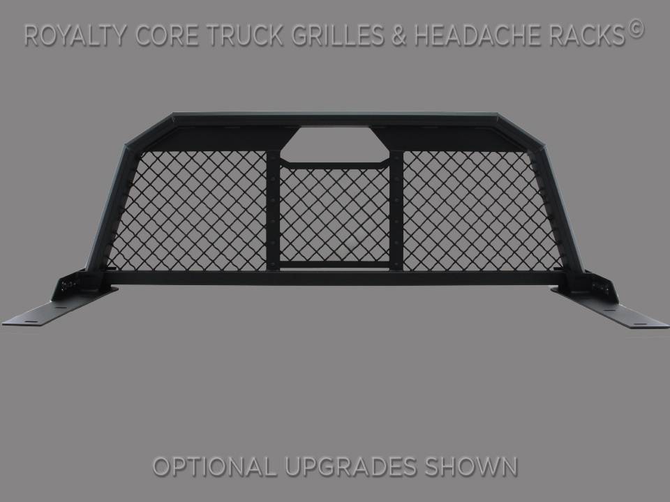 Royalty Core's RC88 Headache Racks replicate the image of their incredible custom grilles for the ultimate appearance. Royalty Core's new T6 Billet Aluminum Mesh diamond design enables maximum rearview visibility and keeps your cab cooler from sun rays. The same custom studs from their grilles hold a removable centerpiece for slider window access. The RC88 Headache Rack is essential for the final line of defense against cargo crashing through your truck's back window with emergency braking, collision, and bumps. The RC88 is a quick and easy install and is removable in minutes with superior adjustable mounting engineered to withstand heavy duty off road use. The RC88 is ideal for carrying long cargo and a beefy support tube runs across the bottom to prevent ATV tires from always bending the front of your truck box out of shape. Each RC88 headache rack is designed to fit your exact truck model and is not one rack fits all.You can order your RC88 with or without knobs, matching cab height or standard, and custom Royalty Core logos add the ultimate touch. The RC88 is built in house using One-of-a-Kind 4?x 2? Octagon wide profile T6 Billet tubing laid out in a heavy duty double framed construction for literally the toughest headache rack on the market. The RC88 features T6 Aluminum Billet Mesh, which is corrosion resistant and flexible to better prevent denting in the event of cargo contact. The RC88 has 24 inch base plates compatible with all bed toolboxes and custom brackets are available for warning lights, signs, beacons, flags, and lights. Finishes available are jet gloss black, satin black, or custom color matching of any factory color. The RC88 Headache Rack is backed by a Lifetime Warranty!Details