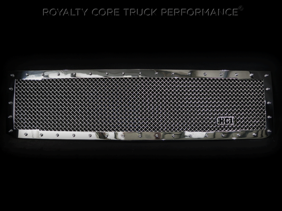 Royalty Core's classic RC1 grille design has clean lines with a dynamic 2-tone appearance for truck enthusiasts looking to make a bold statement. This RC1 design screams one custom grille and it shows with a distinct footprint. This grille exposes Royalty Core's race proven diamond mesh for accelerated airflow and appearance.Each grille has been rigorously tested by Royalty Core engineers to maximize protection, appearance, and performance on and off-road. Lab tried with rapid salt and chemical spray tests proving the most resilient grille on the market against the harshest conditions. Simple direct bolt on Royalty Core grilles are engineered to exploit the cleanest installation possible for your specific truck model.Royalty Core's proprietary corrosion resistant stainless technology creates the most durable grille on the planet. Absolutely every piece is 100% T304 stainless steel. It's engineered to exploit the cleanest installation possible for your specific truck model. This Royalty Core grille is customized to best match your truck with military grade strength you can count on such as a 12 gauge stainless steel construction, optimal mounting brackets, CNC precision machined brackets, frame, and logos, hand fabricated, all gloss surfaces are buffed to a deep smooth mirrored finish,triple chrome plated T304 stainless studs around frame with star flange design, stainless super woven mesh, and absolutely no plastic. Royalty Core offers the industry's largest customized line of grilles and logos available.- World Class Quality by Royalty Core Built by Hand in the USA-No Comparison