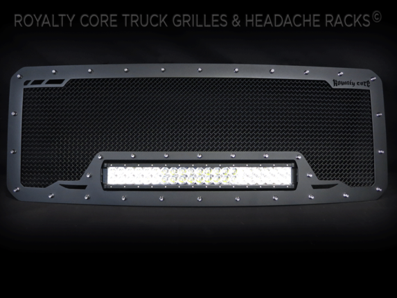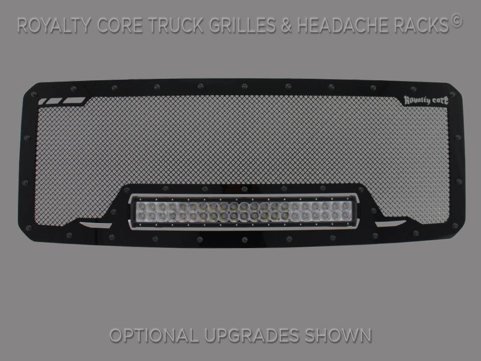 This grille includes an insanely powerful mounted and balanced 23 inch LED light bar.Including a weatherproof Deutsch connector with plug-and-play, polycarbonate lens, and isolated rubber mounts for vibration control. An updated multi-voltelectronicsincrease output with a seamless beam pattern featuring a 50,000 hour lifespan.Being manufactured from extruded 6061 aluminum, this LED is tough enough for all conditions. The front has the ultimate protection of the unbreakable polycarbonate lens. Royalty Core's proprietary corrosion resistant stainless technology creates the most durable grille on the planet. Absolutely every piece is 100% T304 stainless steel. It's engineered to exploit the cleanest installation possible for your specific truck model. This Royalty Core grille is customized to best match your truck with military grade strength you can count on such as a 12 gauge stainless steel construction, optimal mounting brackets, CNC precision machined brackets, frame, and logos, hand fabricated, all gloss surfaces are buffed to a deep smooth mirrored finish,triple chrome plated T304 stainless studs around frame with star flange design, stainless super woven mesh, and absolutely no plastic. Royalty Core offers the industry's largest customized line of grilles and logos available.