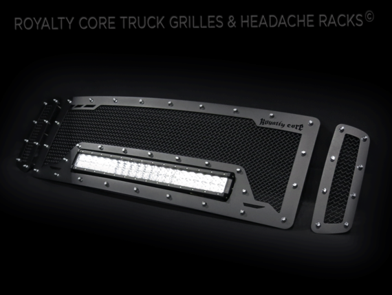 This grille includes an insanely powerful mounted and balanced 23 inch LED light bar.Including a weatherproof Deutsch connector with plug-and-play, polycarbonate lens, and isolated rubber mounts for vibration control. An updated multi-voltelectronicsincrease output with a seamless beam pattern featuring a 50,000 hour lifespan.Being manufactured from extruded 6061 aluminum, this LED is tough enough for all conditions. The front has the ultimate protection of the unbreakable polycarbonate lens. Royalty Core's proprietary corrosion resistant stainless technology creates the most durable grille on the planet. Absolutely every piece is 100% T304 stainless steel. It's engineered to exploit the cleanest installation possible for your specific truck model. This Royalty Core grille is customized to best match your truck with military grade strength you can count on such as a 12 gauge stainless steel construction, optimal mounting brackets, CNC precision machined brackets, frame, and logos, hand fabricated, all gloss surfaces are buffed to a deep smooth mirrored finish,triple chrome plated T304 stainless studs around frame with star flange design, stainless super woven mesh, and absolutely no plastic. Royalty Core offers the industry's largest customized line of grilles and logos available.