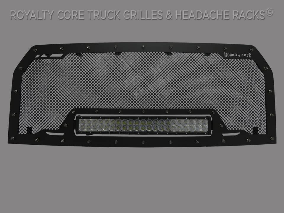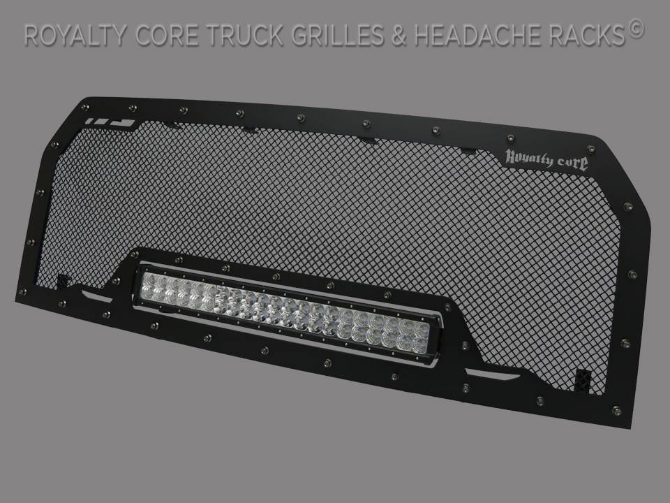This grille includes an insanely powerful mounted and balanced 23 inch LED light bar.Including a weatherproof Deutsch connector with plug-and-play, polycarbonate lens, and isolated rubber mounts for vibration control. An updated multi-voltelectronicsincrease output with a seamless beam pattern featuring a 50,000 hour lifespan.Being manufactured from extruded 6061 aluminum, this LED is tough enough for all conditions. The front has the ultimate protection of the unbreakable polycarbonate lens. Royalty Core's proprietary corrosion resistant stainless technology creates the most durable grille on the planet. Absolutely every piece is 100% T304 stainless steel. It's engineered to exploit the cleanest installation possible for your specific truck model. This Royalty Core grille is customized to best match your truck with military grade strength you can count on such as a 12 gauge stainless steel construction, optimal mounting brackets, CNC precision machined brackets, frame, and logos, hand fabricated, all gloss surfaces are buffed to a deep smooth mirrored finish,triple chrome plated T304 stainless studs around frame with star flange design, stainless super woven mesh, and absolutely no plastic. Royalty Core offers the industry's largest customized line of grilles and logos available.