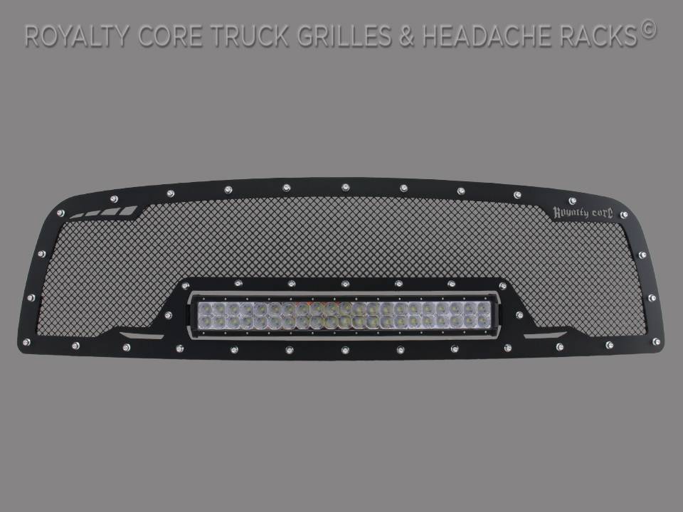 This grille includes an insanely powerful mounted and balanced 23 inch LED light bar.Including a weatherproof Deutsch connector with plug-and-play, polycarbonate lens, and isolated rubber mounts for vibration control. An updated multi-voltelectronicsincrease output with a seamless beam pattern featuring a 50,000 hour lifespan.Being manufactured from extruded 6061 aluminum, this LED is tough enough for all conditions. The front has the ultimate protection of the unbreakable polycarbonate lens. Royalty Core's proprietary corrosion resistant stainless technology creates the most durable grille on the planet. Absolutely every piece is 100% T304 stainless steel. It's engineered to exploit the cleanest installation possible for your specific truck model. This Royalty Core grille is customized to best match your truck with military grade strength you can count on such as a 12 gauge stainless steel construction, optimal mounting brackets, CNC precision machined brackets, frame, and logos, hand fabricated, all gloss surfaces are buffed to a deep smooth mirrored finish,triple chrome plated T304 stainless studs around frame with star flange design, stainless super woven mesh, and absolutely no plastic. Royalty Core offers the industry's largest customized line of grilles and logos available.