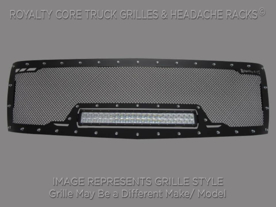 truck model.Royalty Core's proprietary corrosion resistant stainless technology creates the most durable grille on the planet. Absolutely every piece is 100% T304 stainless steel. It's engineered to exploit the cleanest installation possible for your specific truck model. This Royalty Core grille is customized to best match your truck with military grade strength you can count on such as a 12 gauge stainless steel construction, optimal mounting brackets, CNC precision machined brackets, frame, and logos, hand fabricated, all gloss surfaces are buffed to a deep smooth mirrored finish,triple chrome plated T304 stainless studs around frame with star flange design, stainless super woven mesh, and absolutely no plastic. Royalty Core offers the industry's largest customized line of grilles and logos available.