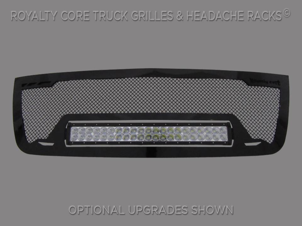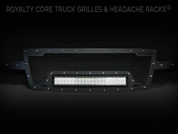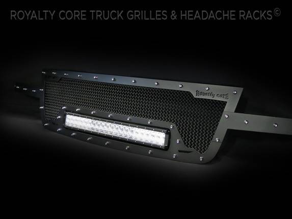 This grille includes an insanely powerful mounted and balanced 23 inch LED light bar.Including a weatherproof Deutsch connector with plug-and-play, polycarbonate lens, and isolated rubber mounts for vibration control. An updated multi-voltelectronicsincrease output with a seamless beam pattern featuring a 50,000 hour lifespan.Being manufactured from extruded 6061 aluminum, this LED is tough enough for all conditions. The front has the ultimate protection of the unbreakable polycarbonate lens. Royalty Core's proprietary corrosion resistant stainless technology creates the most durable grille on the planet. Absolutely every piece is 100% T304 stainless steel. It's engineered to exploit the cleanest installation possible for your specific truck model. This Royalty Core grille is customized to best match your truck with military grade strength you can count on such as a 12 gauge stainless steel construction, optimal mounting brackets, CNC precision machined brackets, frame, and logos, hand fabricated, all gloss surfaces are buffed to a deep smooth mirrored finish,triple chrome plated T304 stainless studs around frame with star flange design, stainless super woven mesh, and absolutely no plastic. Royalty Core offers the industry's largest customized line of grilles and logos available.