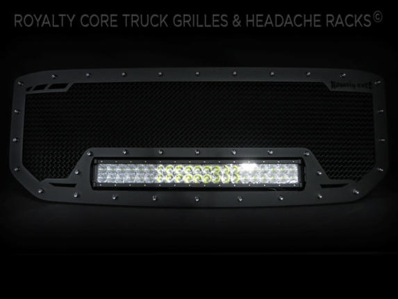This grille includes an insanely powerful mounted and balanced 23 inch LED light bar.Including a weatherproof Deutsch connector with plug-and-play, polycarbonate lens, and isolated rubber mounts for vibration control. An updated multi-voltelectronicsincrease output with a seamless beam pattern featuring a 50,000 hour lifespan.Being manufactured from extruded 6061 aluminum, this LED is tough enough for all conditions. The front has the ultimate protection of the unbreakable polycarbonate lens. Royalty Core's proprietary corrosion resistant stainless technology creates the most durable grille on the planet. Absolutely every piece is 100% T304 stainless steel. It's engineered to exploit the cleanest installation possible for your specific truck model. This Royalty Core grille is customized to best match your truck with military grade strength you can count on such as a 12 gauge stainless steel construction, optimal mounting brackets, CNC precision machined brackets, frame, and logos, hand fabricated, all gloss surfaces are buffed to a deep smooth mirrored finish,triple chrome plated T304 stainless studs around frame with star flange design, stainless super woven mesh, and absolutely no plastic. Royalty Core offers the industry's largest customized line of grilles and logos available.