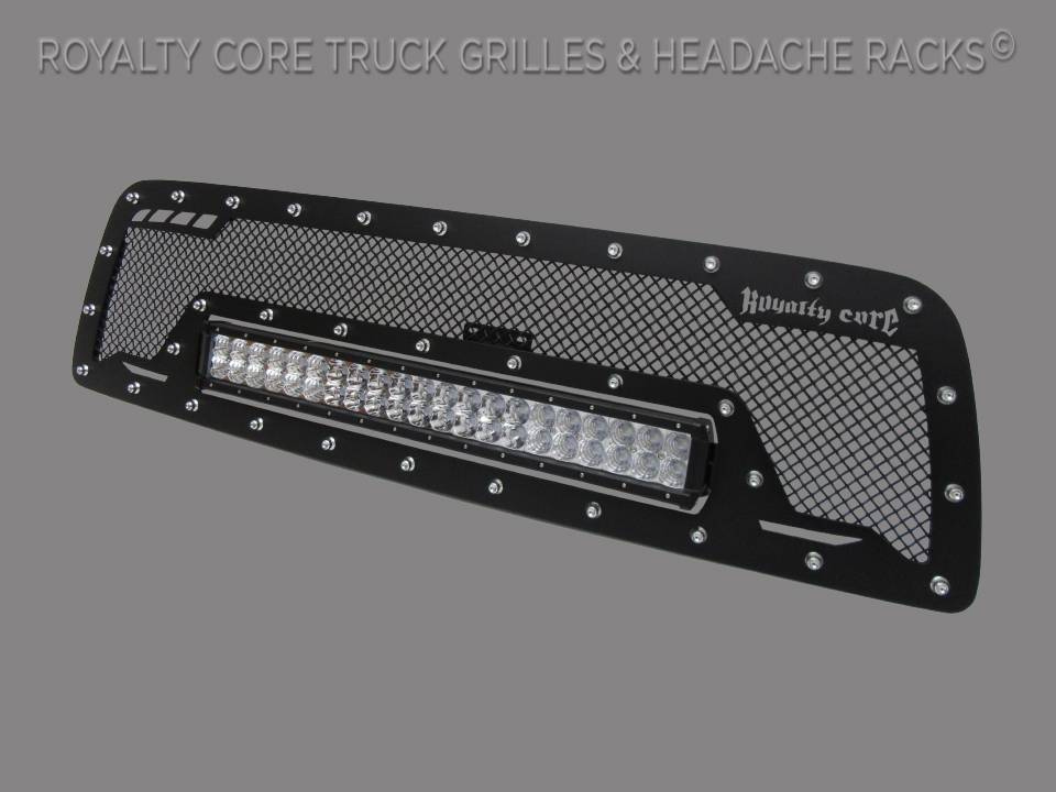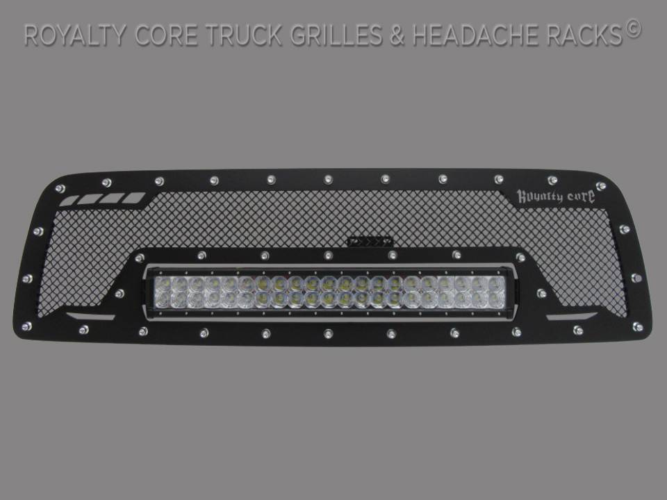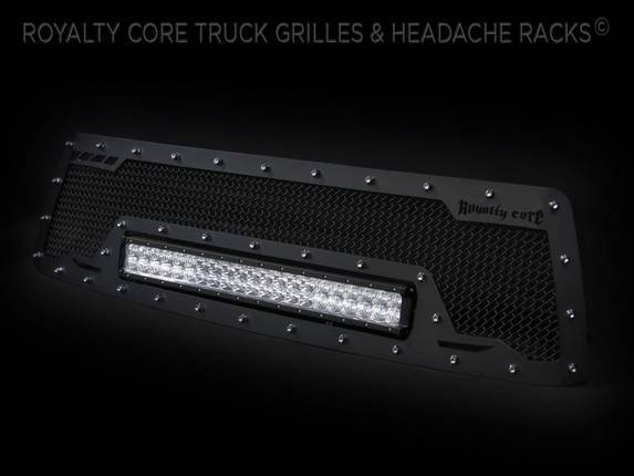 This grille includes an insanely powerful mounted and balanced 20 inch LED light bar.Including a weatherproof Deutsch connector with plug-and-play, polycarbonate lens, and isolated rubber mounts for vibration control. An updated multi-voltelectronicsincrease output with a seamless beam pattern featuring a 50,000 hour lifespan.Being manufactured from extruded 6061 aluminum, this LED is tough enough for all conditions. The front has the ultimate protection of the unbreakable polycarbonate lens. Royalty Core's proprietary corrosion resistant stainless technology creates the most durable grille on the planet. Absolutely every piece is 100% T304 stainless steel. It's engineered to exploit the cleanest installation possible for your specific truck model. This Royalty Core grille is customized to best match your truck with military grade strength you can count on such as a 12 gauge stainless steel construction, optimal mounting brackets, CNC precision machined brackets, frame, and logos, hand fabricated, all gloss surfaces are buffed to a deep smooth mirrored finish,triple chrome plated T304 stainless studs around frame with star flange design, stainless super woven mesh, and absolutely no plastic. Royalty Core offers the industry's largest customized line of grilles and logos available.