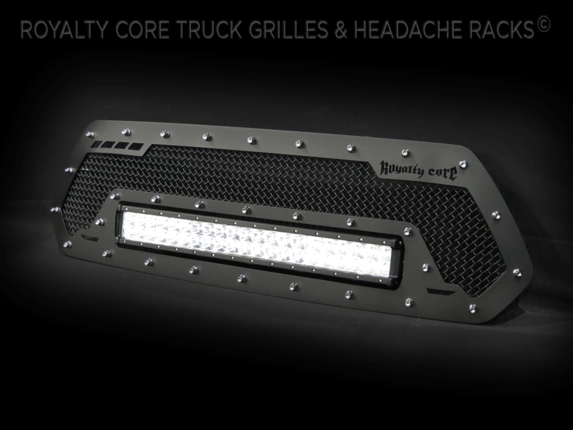This grille includes an insanely powerful mounted and balanced 20 inch LED light bar.Including a weatherproof Deutsch connector with plug-and-play, polycarbonate lens, and isolated rubber mounts for vibration control. An updated multi-voltelectronicsincrease output with a seamless beam pattern featuring a 50,000 hour lifespan.Being manufactured from extruded 6061 aluminum, this LED is tough enough for all conditions. The front has the ultimate protection of the unbreakable polycarbonate lens. Royalty Core's proprietary corrosion resistant stainless technology creates the most durable grille on the planet. Absolutely every piece is 100% T304 stainless steel. It's engineered to exploit the cleanest installation possible for your specific truck model. This Royalty Core grille is customized to best match your truck with military grade strength you can count on such as a 12 gauge stainless steel construction, optimal mounting brackets, CNC precision machined brackets, frame, and logos, hand fabricated, all gloss surfaces are buffed to a deep smooth mirrored finish,triple chrome plated T304 stainless studs around frame with star flange design, stainless super woven mesh, and absolutely no plastic. Royalty Core offers the industry's largest customized line of grilles and logos available.