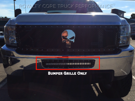 Complete and reinforce your truck with Royalty Core's impressive bumper grille package. This uniquely designed bumper grille smooths your factory bumpers dead space while exposing the function of your tow hooks. The options on your bumper grille will come to match when ordered with your main upper grille.
