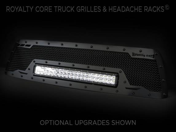 This grille includes an insanely powerful mounted and balanced 22 inch LED light bar.Including a weatherproof Deutsch connector with plug-and-play, polycarbonate lens, and isolated rubber mounts for vibration control. An updated multi-voltelectronicsincrease output with a seamless beam pattern featuring a 50,000 hour lifespan.Being manufactured from extruded 6061 aluminum, this LED is tough enough for all conditions. The front has the ultimate protection of the unbreakable polycarbonate lens. Royalty Core's proprietary corrosion resistant stainless technology creates the most durable grille on the planet. Absolutely every piece is 100% T304 stainless steel. It's engineered to exploit the cleanest installation possible for your specific truck model. This Royalty Core grille is customized to best match your truck with military grade strength you can count on such as a 12 gauge stainless steel construction, optimal mounting brackets, CNC precision machined brackets, frame, and logos, hand fabricated, all gloss surfaces are buffed to a deep smooth mirrored finish,triple chrome plated T304 stainless studs around frame with star flange design, stainless super woven mesh, and absolutely no plastic. Royalty Core offers the industry's largest customized line of grilles and logos available.