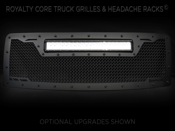 This grille includes an insanely powerful mounted and balanced 23 inch LED light bar.Including a weatherproof Deutsch connector with plug-and-play, polycarbonate lens, and isolated rubber mounts for vibration control. An updated multi-voltelectronicsincrease output with a seamless beam pattern featuring a 50,000 hour lifespan.Being manufactured from extruded 6061 aluminum, this LED is tough enough for all conditions. The front has the ultimate protection of the unbreakable polycarbonate lens. Royalty Core's proprietary corrosion resistant stainless technology creates the most durable grille on the planet. Absolutely every piece is 100% T304 stainless steel. It's engineered to exploit the cleanest installation possible for your specific truck model. This Royalty Core grille is customized to best match your truck with military grade strength you can count on such as a 12 gauge stainless steel construction, optimal mounting brackets, CNC precision machined brackets, frame, and logos, hand fabricated, all gloss surfaces are buffed to a deep smooth mirrored finish,triple chrome plated T304 stainless studs around frame with star flange design, stainless super woven mesh, and absolutely no plastic. Royalty Core offers the industry's largest customized line of grilles and logos available.